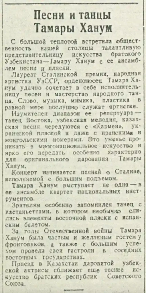 Лауреат Сталинской премии, народная артистка УзССР, орденоносец Тамара Ханум удачно сочетает в себе исполнительницу песен и мастерство народного танца. Слово, музыка, мимика, пластика в равной мере послушно служат артистке.