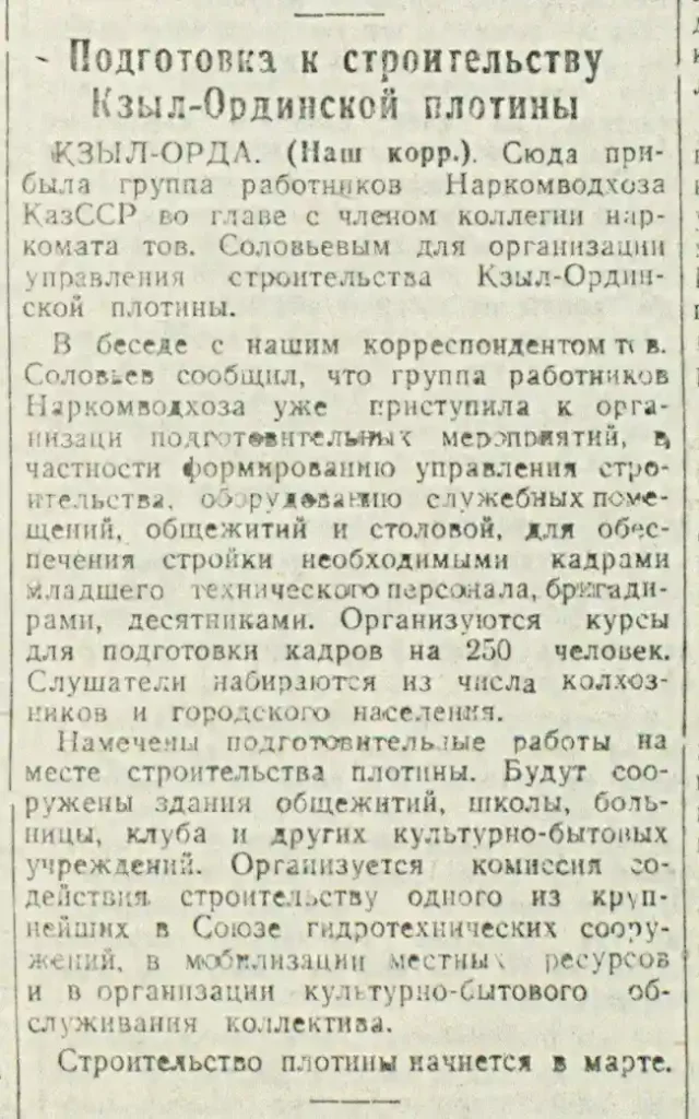 Кзыл-Орда. (Наш корр.). Сюда прибыла группа работников Наркомводхоза КазССР во главе с членом коллегии наркомата тов. Соловьевым для организации управления строительства Кзыл-Ординской плотины.