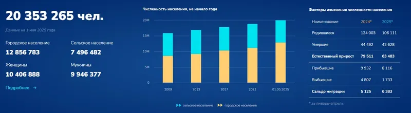 На 1 мая 2025 года в стране проживало 20 353 265 человек, что на 19 735 больше, чем месяцем ранее (20 333 530).