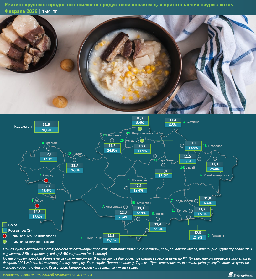 Мы сравнили также стоимость наурыз-коже с прошлогодним показателем, где источник данных и набор продуктов были аналогичными. Оказалось, что за год продуктовая корзина для этого праздничного блюда выросла в цене в среднем по стране на 20,6%. Для отдельных городов удорожание было ещё более существенным: плюс 28,4% в Кызылорде, плюс 26,7% — в Актобе. Наименее ощутимый рост цен пришёлся на Талдыкорган (плюс 6,4%) и Петропавловск (плюс 8,4%).