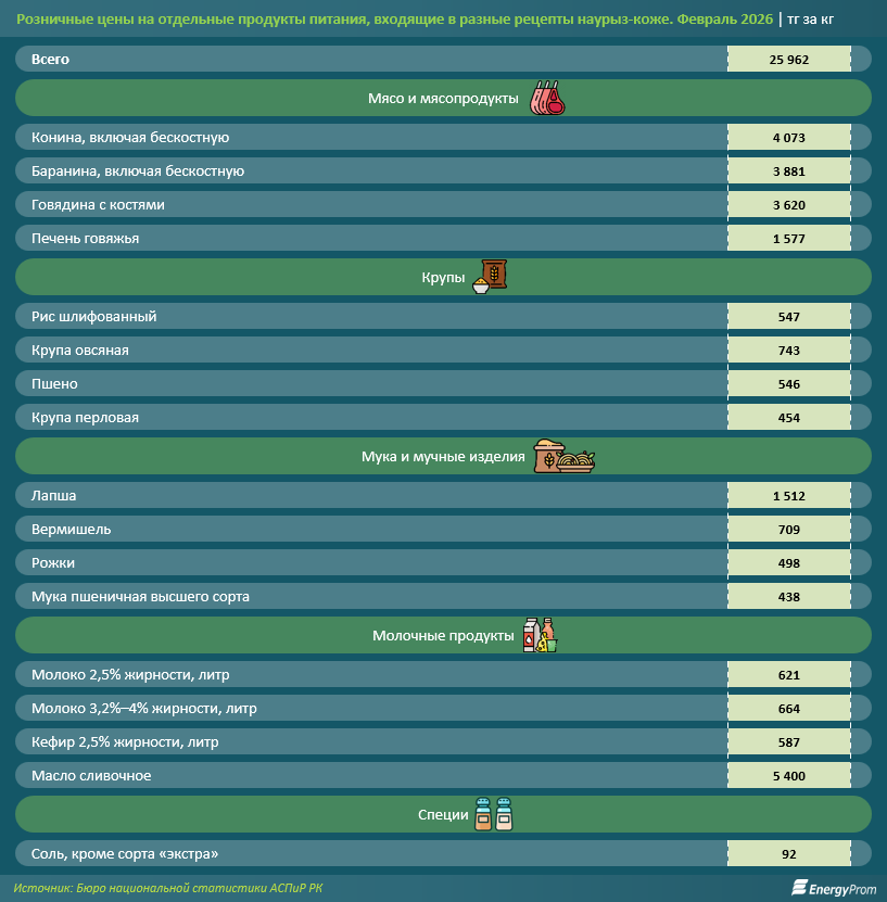 По традиции перед праздником energyprom.kz анализируем, во сколько обходятся ингредиенты для наурыз-коже в разных регионах страны. Несмотря на то что у семей могут быть свои варианты рецепта, базовый набор включает семь компонентов. Для расчёта мы использовали усреднённый вариант: говядина, крупы (пшено, рис, перловка), кефир, молоко, сливочное масло и соль.