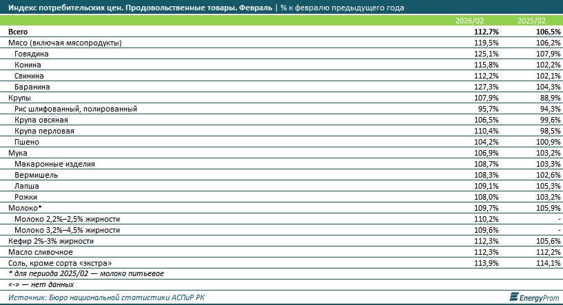 Предлагаем также рассмотреть, как за последний год менялись цены на главные ингредиенты наурыз-коже. Отметим сразу: годовые индексы потребительских цен на продукты в конце этой зимы были куда выше, чем в прошлом году. Если в феврале 2025-го продукты в целом подорожали за год на 6,5%, то в аналогичном месяце текущего года их стоимость выросла уже на 12,7%.