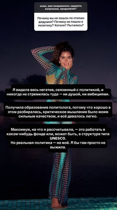 «Я видела весь негатив, связанный с политикой, и никогда не стремилась туда — ни душой, ни амбициями», — сообщила она.