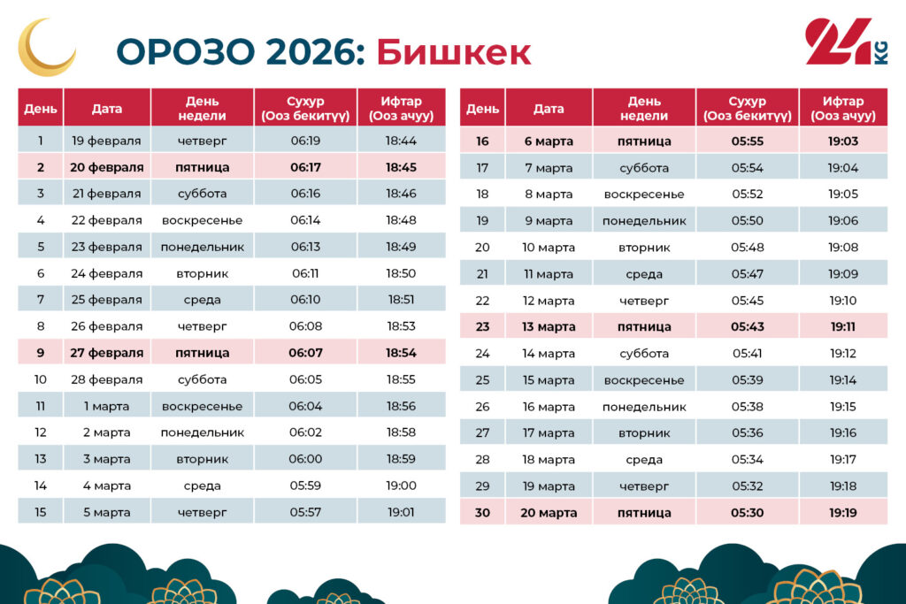 🇰🇬 Орозо-2026. Календарь начала воздержания и разговения