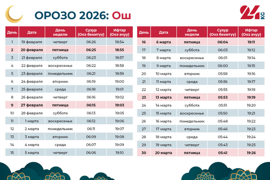 Духовное управление мусульман КР подготовило календарь Орозо на 2026 год. В нём указано расписание для постящихся — время начала воздержания и разговения в разных городах страны.