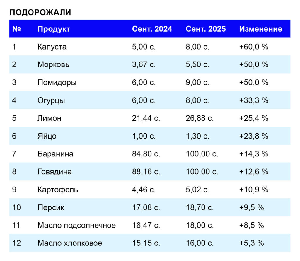 Среди овощей наибольший рост показала капуста — плюс 60 %, а также морковь — плюс 50 %. В мясной категории заметнее всего подорожали баранина (на 14,3 %) и говядина (на 12,6 %). Подсолнечное масло прибавило в цене 8,5 %.