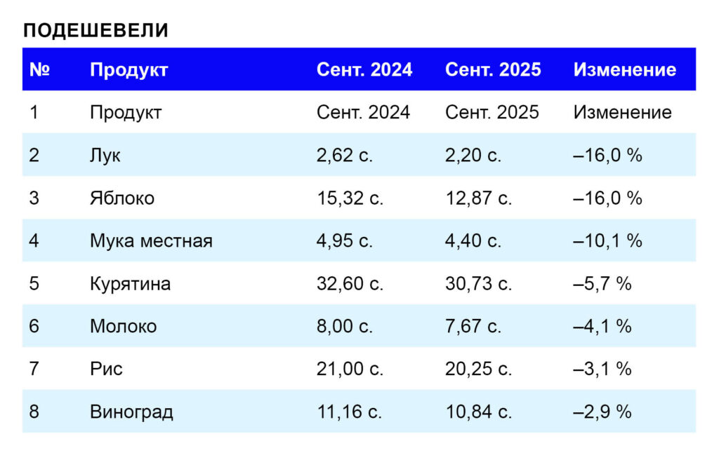 В то же время ряд продуктов стал доступнее: гранаты подешевели на 28,2 %, яблоки — на 16 %, мандарины — на 14,6 %. Снижение цен зафиксировано и на основные продукты питания: мука — минус 10,1 %, рис — минус 3,1 %, сыр — минус 6,1 %. Среди молочной продукции дешевле стали молоко (–4,1 %) и сливочное масло (–2,7 %).