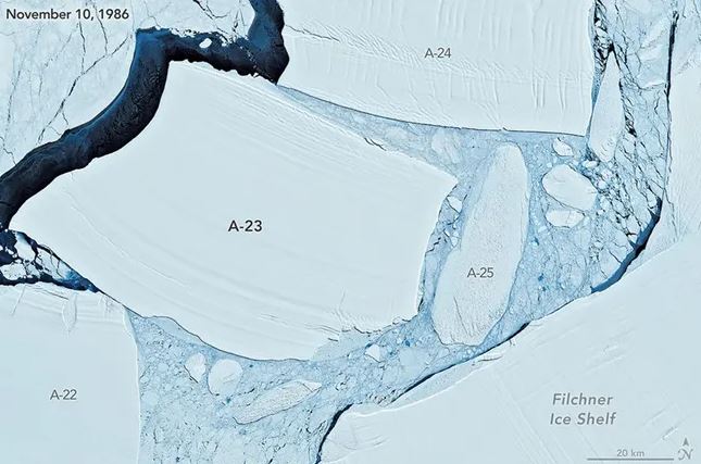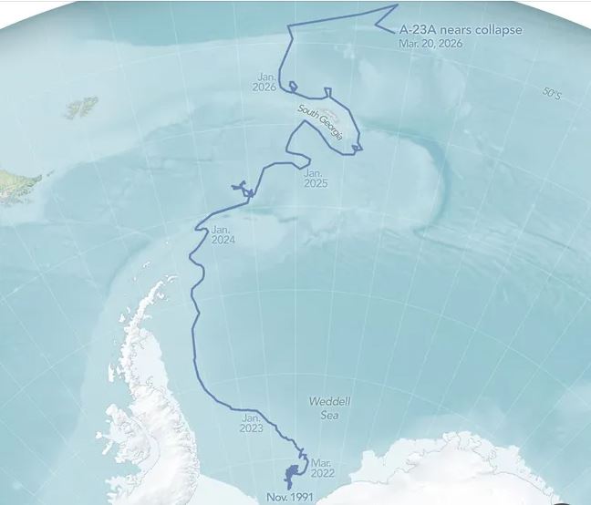 За последние три месяца А23а прошёл примерно тысячу километров, пересёк границу Южного и Атлантического океанов и сейчас дрейфует в районе 49‑й южной параллели.