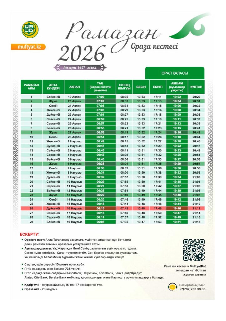 🇰🇿 Рамазан-2026: расписание поста по городам Казахстана