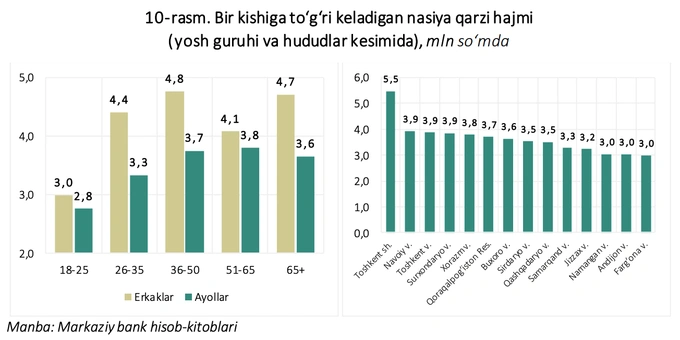 В целом по стране самая высокая задолженность на одного человека по рассрочке наблюдается в возрастной группе 36−50 лет — 4,2 млн сумов, а самая низкая — среди молодёжи 18−25 лет — 2,9 млн сумов. В региональном разрезе наибольший показатель зафиксирован в Ташкенте — 5,5 млн сумов, что почти в 1,5 раза выше, чем средний показатель по республике (3,7 млн сумов).