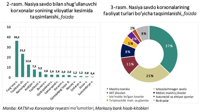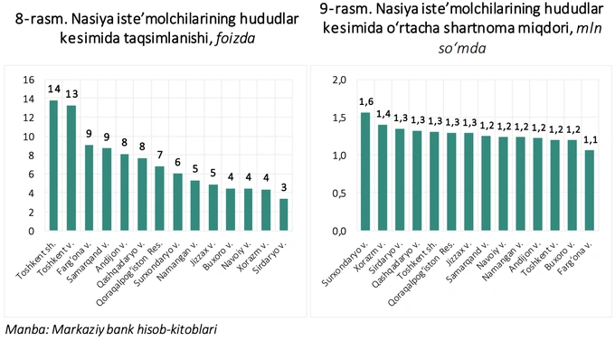 В региональном разрезе на долю Ташкента и Ташкентской области приходится 27% всех потребителей рассрочки, на Ферганскую и Самаркандскую области — по 9%, а наименьшая доля отмечается в Бухарской, Навоийской и Хорезмской областях — по 4%, а также в Сырдарьинской области — 3%.