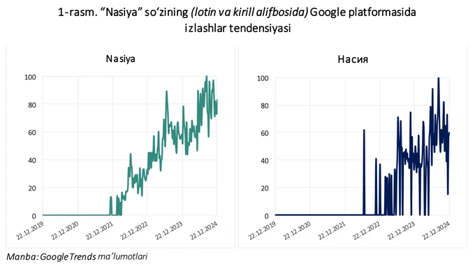 В частности, по данным Google, с конца 2021 года количество поисковых запросов слова «nasiya» (как в латинице, так и на кириллице) демонстрирует устойчивую тенденцию к росту. Это позволяет сделать вывод, что в основном такими поисками интересуется молодёжь и что именно молодые люди проявляют повышенный интерес к покупкам в рассрочку.