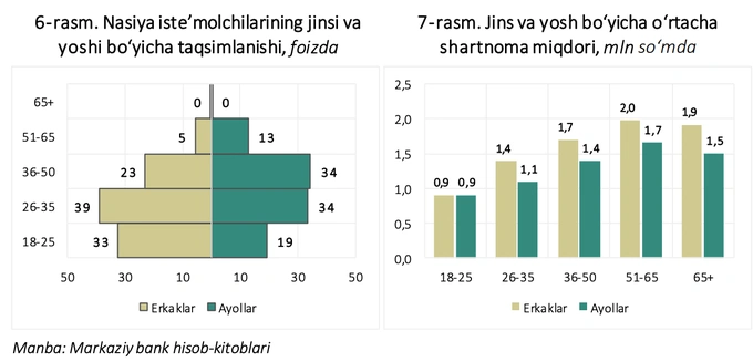 Самая высокая средняя сумма договора зафиксирована в возрастной группе 51−65 лет: у мужчин она составляет 2 млн сумов, у женщин — 1,7 млн сумов. Среди молодёжи в возрасте 18−25 лет средняя сумма договора составляет около 900 тысяч сумов.