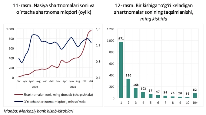 По данным Центрального банка, с февраля 2023 года по декабрь 2024 года количество договоров рассрочки увеличилось с 13,5 тысячи до 973 тысяч (рост в 72,6 раза). При этом средний размер одного договора стабильно держится на уровне около 1,2 млн сумов.