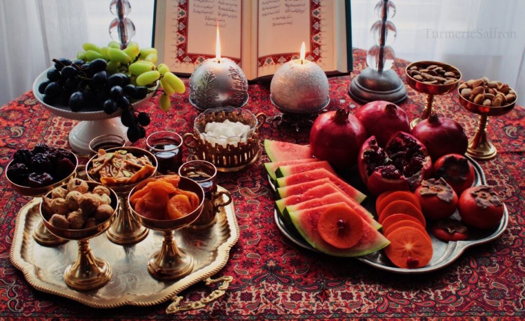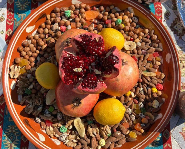 Некоторые пожилые люди вспоминают, что в семьях хранили арбуз специально для этого праздника, чтобы долгими ночами, собираясь всей семьей, полакомиться им. Но историки считают, что каждое из перечисленных фруктов имело свой смысл: например, арбуз или дыня были напоминанием о летнем тепле, а гранат считался символом продолжения рода. В числе обязательных лакомств была и халва — она маслянистая и хорошо согревает в холод.