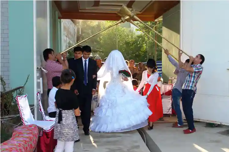 А в Исфаре, например, после свадебного обряда жених с невестой едут к ней домой, где их запирают на три дня, в течение которых приносят дары: мясные блюда, фрукты, сладости. Молодожёны только кушают и спят, не делая никаких дел по дому. Считается, что невесте там гораздо спокойнее, и первая брачная ночь в стенах родного дома не так страшит. После положенного срока жених увозит невесту в свой дом, где и продолжает жить новая семья