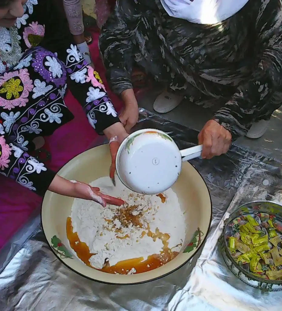 В Кулябе (как и в некоторых других регионах) в доме жениха невеста в течение 5-7 дней считается гостьей, поэтому ничего не делает на кухне. Затем свекровь и бабушка мужа окунает её руки в масло, а затем в муку – после этого она становится хозяйкой на кухне. Тесто домешивают и пекут лепёшки.