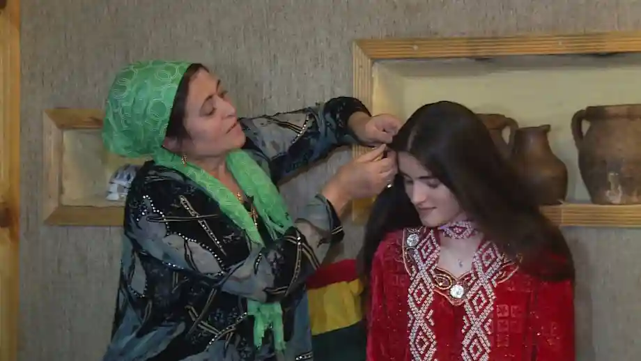 После купания невеста облачается в традиционные свадебные одежды: шаровары, джурабы, платок и платье красного цвета. Затем взрослая, счастливая в браке женщина, переплетает ей косы из девичьей причёски в женскую: вплетает печак (цветные шерстяные шнурки) в косички, к концам которых прикрепляют кисточки. Это символ перехода девушки в новое состояние, так как до свадьбы (по обычаям) девушки не должны носить в волосах ни лент, ни шнурков.