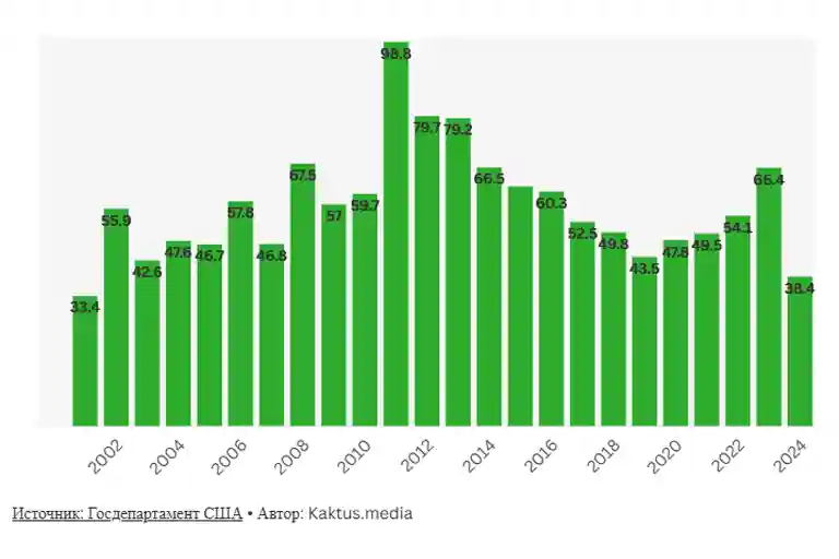 Всего за последние четыре года правительство США выделило Кыргызстану $208,5 млн. Отметим также, что в прошлом году по сравнению с 2023-м объемы финансирования сократились почти на $28 млн — с $66,4 до $38,4 млн.