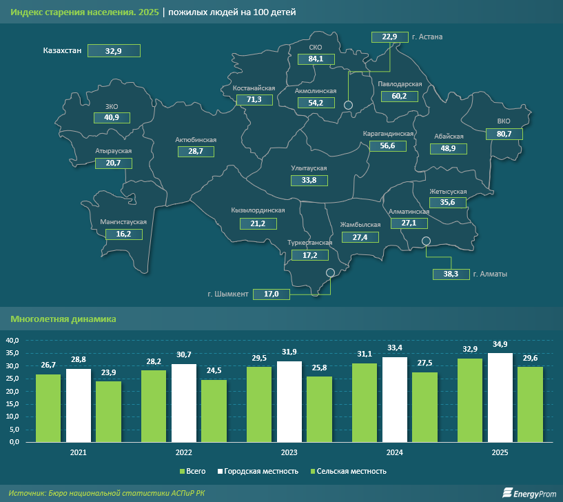 Особенно напряжённой выглядит ситуация в ряде регионов, где фактически сформировалась структура выраженного старения. Максимальные значения зафиксированы в Северо-Казахстанской (84,1), Восточно-Казахстанской (80,7) и Костанайской (71,3) областях. В этих субъектах численность пожилых граждан в ближайшей перспективе может вплотную приблизиться к числу детей. Высокие уровни также отмечаются в Павлодарской (60,2), Карагандинской (56,6) и Акмолинской (54,2) областях, что указывает на крайне неблагоприятную демографическую структуру.