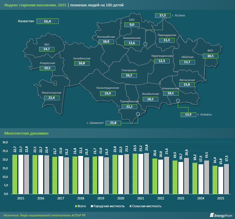 Противоположную картину пока демонстрируют южные и нефтедобывающие регионы с более молодой демографией — Мангистауская (16,2) и Туркестанская (17,2) области, Шымкент (17) и Атырауская область (20,7). Однако даже здесь индекс старения постепенно растёт — эффект объясняется более низкой стартовой базой, но не меняет общего отрицательного тренда на уровне страны.