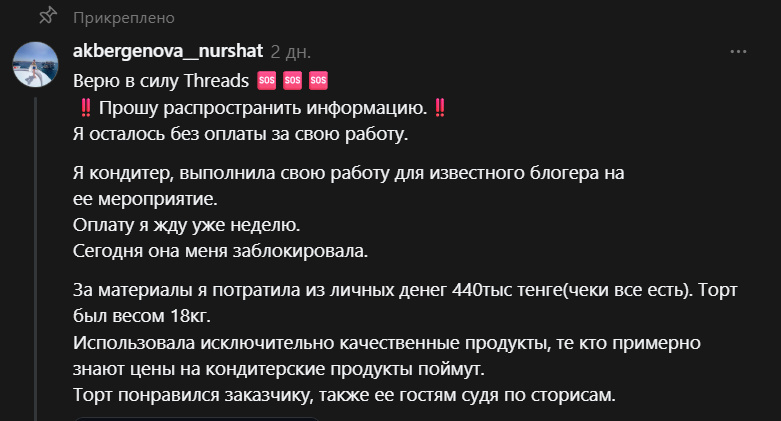 История началась 9 августа, когда Нуршат Акбергенова опубликовала пост в Threads, обвинив известную блогерку в том, что та заказала торт к своему дню рождения, но не оплатила его. По словам кондитера, она потратила на ингредиенты и материалы 440 тысяч тенге (примерно 71,6 тысячи сомов) из собственных средств. Вес торта составил 18 килограммов.