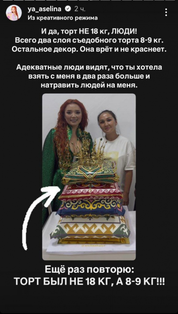 Аселина Батыр прокомментировала ситуацию, заявив, что вес торта составлял «не 18, а 8–9 килограммов», а остальная часть — «это был декор». В своём Instagram она также отметила, что перевела Нуршат Акбергеновой предоплату в размере 100 тысяч тенге и приложила скриншот переписки в качестве подтверждения.