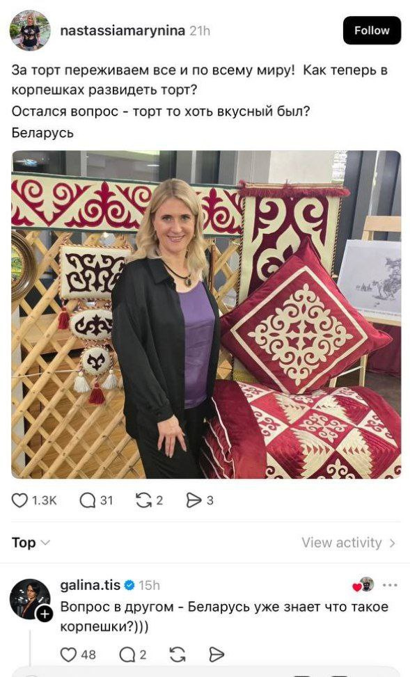 В соцсети Threads обсуждение конфликта между кондитером и блогером вызвало широкий резонанс. Мнения пользователей разделились: одни встали на сторону Аселины Батыр, отмечая, что кондитер должна была заранее озвучить стоимость торта. Другие поддержали Нуршат Акбергенову, сочтя её позицию справедливой.