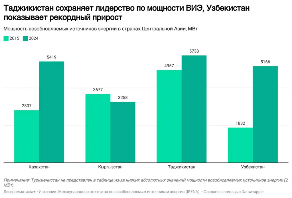 В отличие от соседей, в Кыргызстане зафиксировано снижение мощностей ВИЭ на 11,4% — с 3677 МВт в 2015 году до 3258 МВт в 2024 году. Причины этого падения в отчёте IRENA не уточняются.