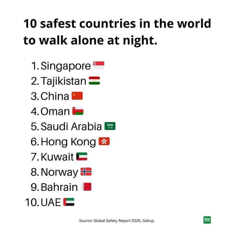 Исследование охватило 142 государства. В Таджикистане 95% опрошенных заявили, что чувствуют себя в безопасности во время прогулок ночью. Лидером рейтинга стал Сингапур с показателем 98%. В десятку также вошли Китай и Оман (по 94%), Саудовская Аравия (93%), Кувейт и Норвегия (по 91%), а также Бахрейн и ОАЭ (по 90%).