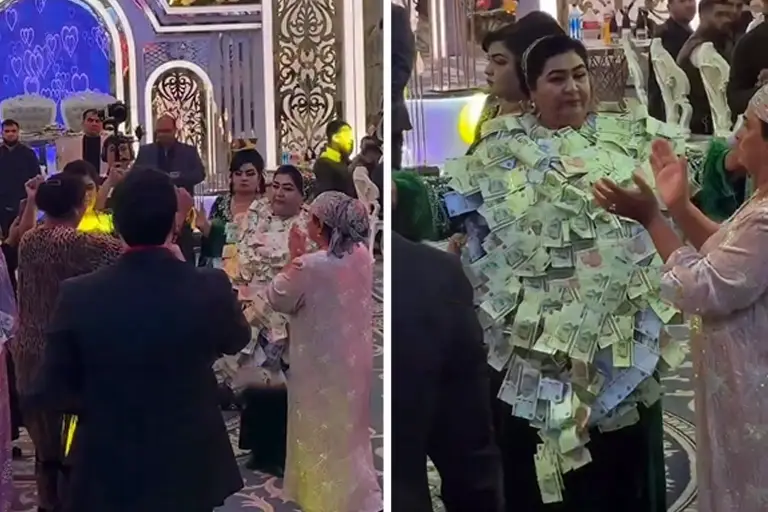 В социальных сетях набирает популярность видео, снятое на одной из свадеб в Самарканде. На кадрах видно необычный наряд мамы жениха — её одежда украшена денежными купюрами.
