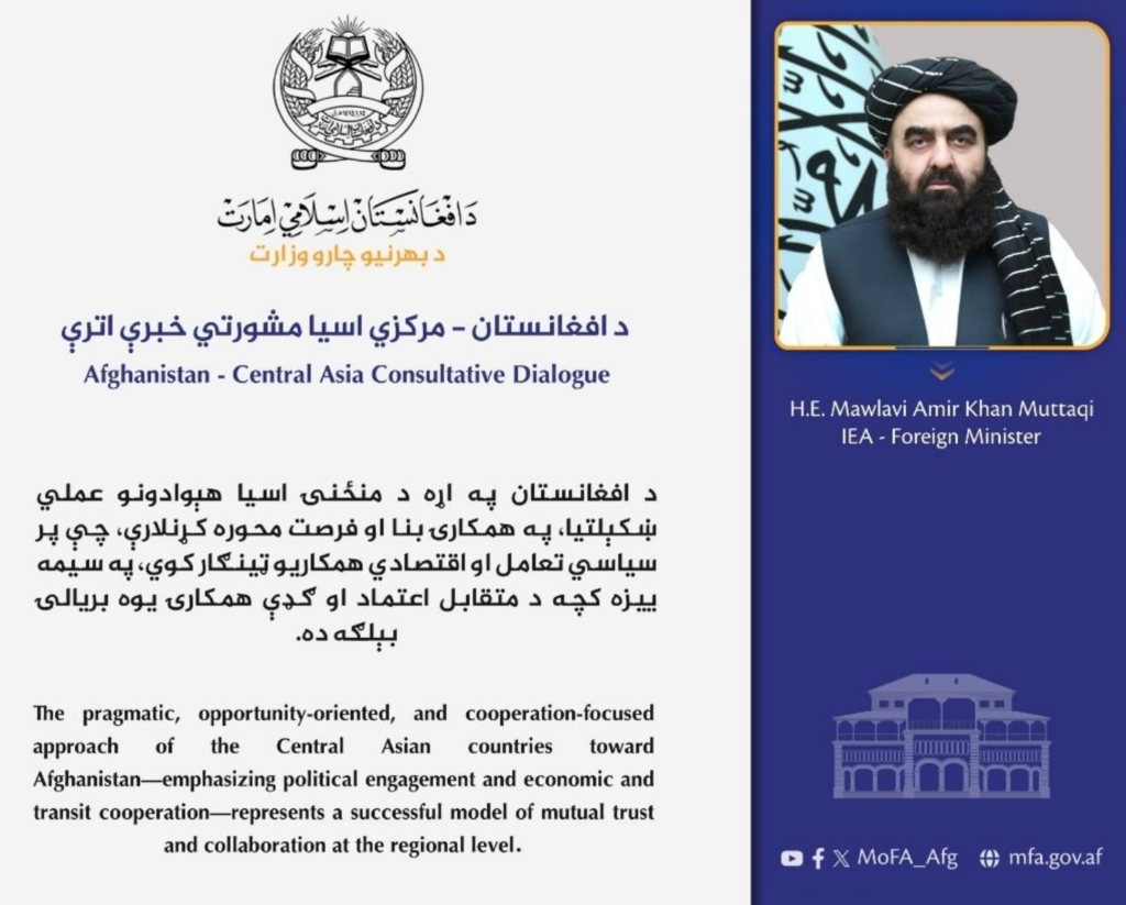 «После почти полувека нестабильности Афганистан достиг подлинной исламской системы, реальной стабильности и общенациональной безопасности. Основы государственного управления укрепляются с каждым днём. Административная коррупция устранена, и ведётся работа по упрощению государственных бюрократических процессов и продвижению цифровизации, — заявил по результатам встречи в своих социальных сетях министр иностранных дел Афганистана Амир Хан Муттаки. — Внешняя политика Исламского Эмирата Афганистан основывается на принципах баланса и экономической ориентированности, с акцентом на исламское братство, добрососедство, взаимное уважение и сотрудничество. Страны Центральной Азии занимают особое место в этой политике.