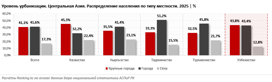 Между тем, в 2025 году в Центральной Азии 41,1% населения проживали в крупных городах — немного меньше, чем в малых и средних (41,6%). Доля сельских жителей составляла 17,3%. Самый высокий уровень урбанизации был зафиксирован в Казахстане: 45,3% населения жили в крупных городах. В малых и средних городах проживали 32,2%, а доля сельских жителей достигала 22,4% — один из самых высоких показателей в регионе, уступающий лишь Кыргызстану (23,1%).