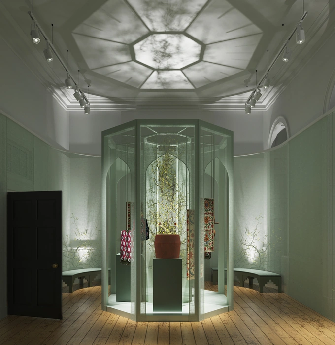 Внутри восьмиугольной конструкции, которая занимает 6 кв. м, кураторы разместили работы, созданные модельером Нигорой Хашимовой, дизайнерами мебели Тиграном Эрдманом и Тимуром Пармановым, вышивальщицей Мадиной Касимбаевой. К творческой группе, представляющей Узбекистан, присоединилась британская художница Рут Шелли, которая создаёт изделия из стекла, вдохновлённые орнаментом и палитрой национальных узбекских тканей.