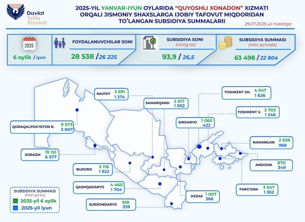 Суммарный объём выплат по госпрограмме «Солнечный дом» достиг 63,5 млрд сумов (более $5 млн по курсу ЦБ), причём свыше трети этой суммы пришлось на июнь. В общей сложности оформлено 93,9 тыс. субсидий, из которых 26,5 тыс. — в июне.