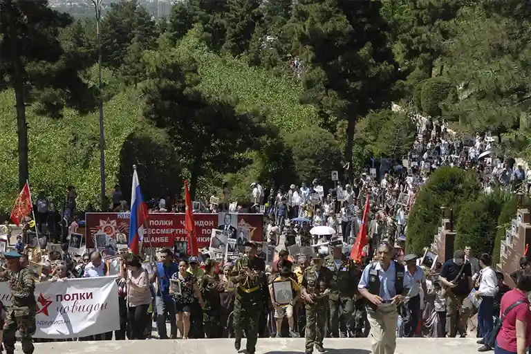 «Бессмертный полк» — это шествие, в котором участвуют родственники жертв Великой Отечественной войны, преимущественно с фотографиями своих близких. Эта кампания ранее проводилась во многих странах бывшего СССР.