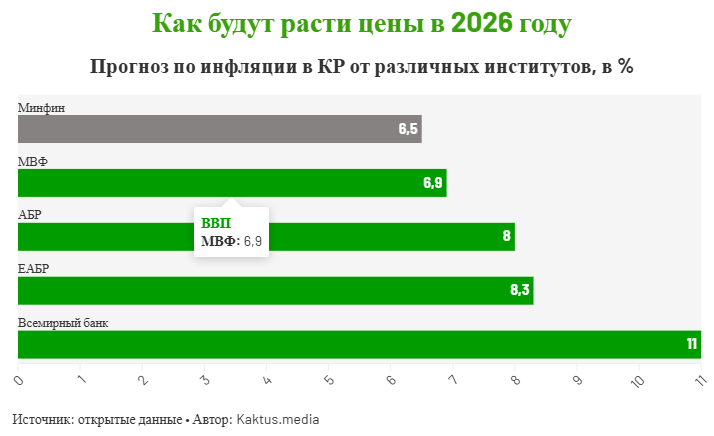 Министерство финансов Кыргызстана считает, что инфляция вырастет с 5,5% — по итогам 2025 года до 6,5% — по итогам 2026-го. При этом рост цен будет держаться на уровне однозначных показателей при условии отсутствия шоков.