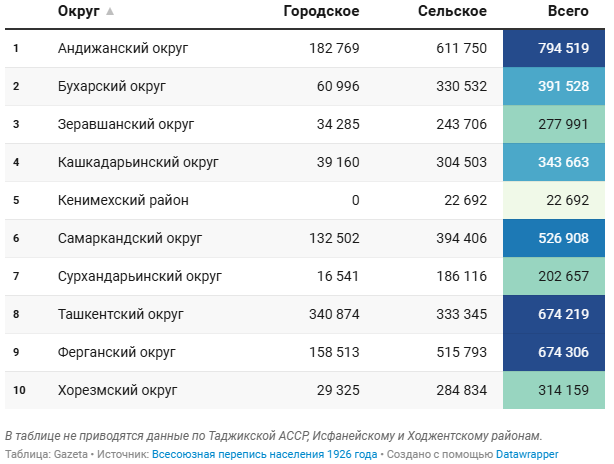 Наиболее населённым округом являлся Андижанский. В его сёлах проживало свыше 600 тысяч человек, а в городах — порядка 183 тысяч. Самыми густонаселёнными были города Ташкентского округа — с общей численностью 340 тысяч человек. Наименее населённым округом был Сурхандарьинский. Общая численность городского населения составила 16,5 тысяч человек, а сельского — 186 тысяч.