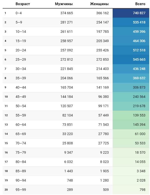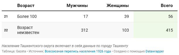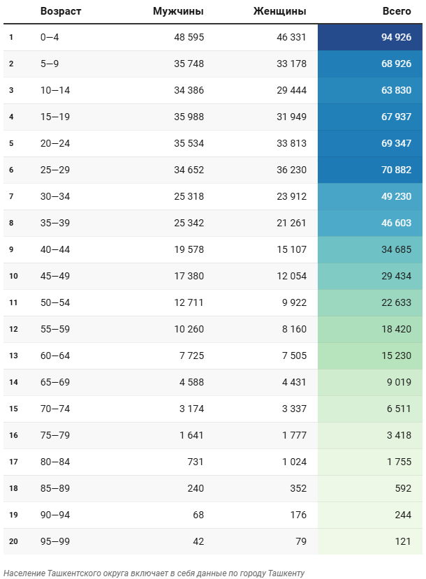 Отдельно автор приводит таблицу с половозрастной структурой населения Ташкентского округа, поскольку сегодня регион является столичным.