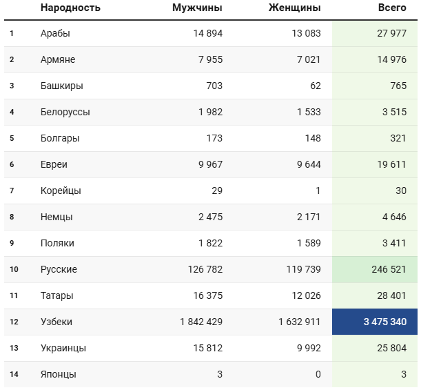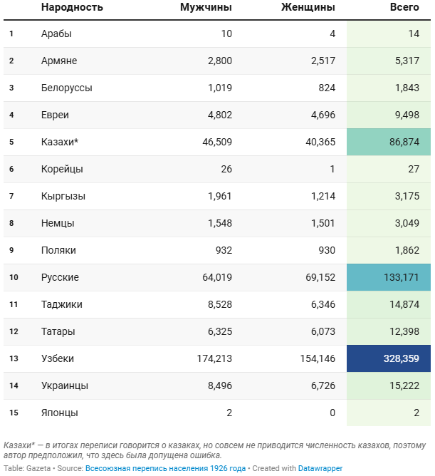 В части народности (национальности) также есть любопытные моменты. Так, например, если респондент относил себя к народности сарт, его приписывали к узбекам, хотя термин использовался населением Средней Азии для обозначения осёдлых тюрков и узбеков. Российская перепись 1897 года пыталась выделить сартов в отдельный этнос, но в советское время они влились в узбекскую народность.