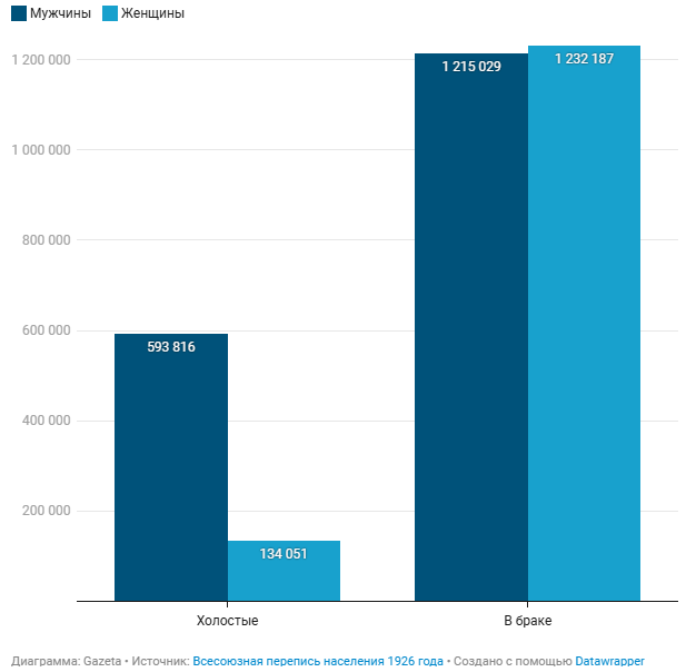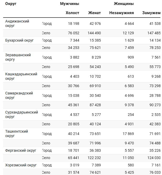 Данные по составу населения интересно сопоставить с цифрами по семейному положению. По всему УзССР в браке состояло около 1,2 миллиона мужчин и 1,2 миллиона женщин. Число холостых мужчин близилось к 595 тысячам, тогда как незамужних женщин было всего 134 тысячи.