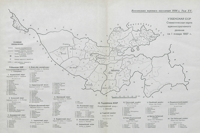 В 1926 году работы по районированию территории УзССР ещё только завершали. В итогах переписи территориальные деления сохранены в границах, актуальных на 1 января 1927 года, говорится в предисловии XV тома. Таким образом, территория УзССР разделена на 13 административных единиц: Андижанский, Бухарский, Зеравшанский, Кашкадарьинский, Самаркандский, Сурхандарьинский, Ташкентский, Ферганский, Ходжентский, Хорезмский округи, Кенимехский и Исфанейский районы, а также Таджикская АССР.