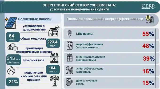 Исследователи отметили, что в регионах с первоначально высоким энергопотреблением — Самаркандской, Ташкентской, Андижанской и Наманганской областях — сокращение оказалось наиболее значительным. При этом качество энергоснабжения улучшилось: 47% домохозяйств отметили положительные изменения в электроснабжении, особенно в Сурхандарьинской (78%), Сырдарьинской (70%) и Наманганской (67%) областях. Обеспечение природным газом улучшилось у 39% респондентов, а поставки сжиженного газа — у 45%, с самыми высокими показателями в Сырдарьинской, Сурхандарьинской и Наманганской областях.