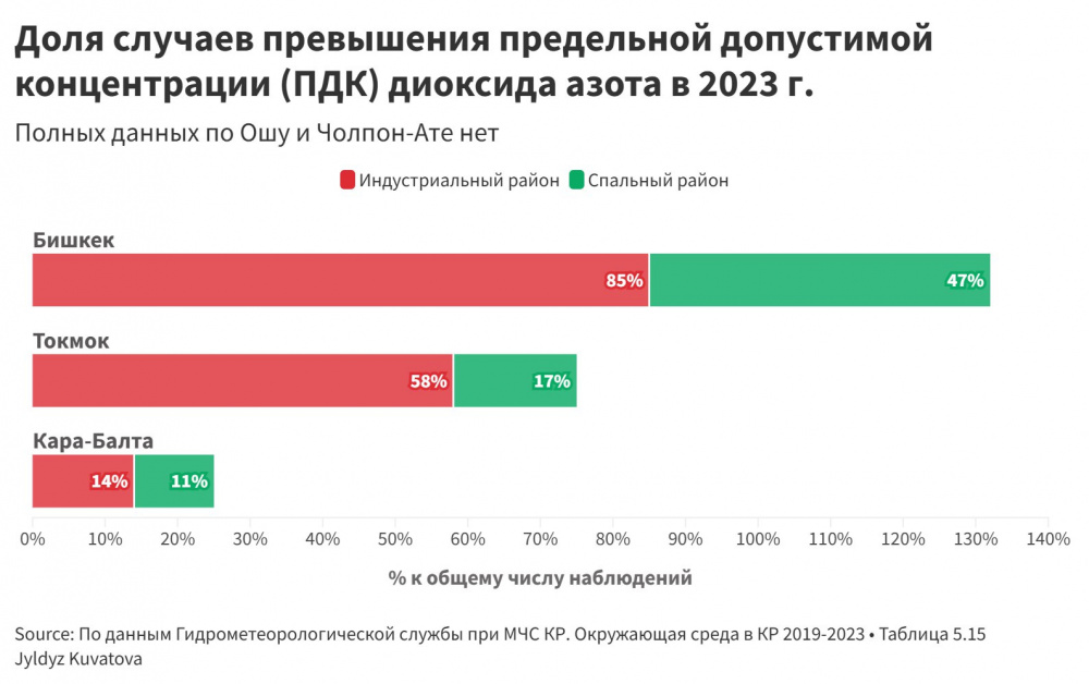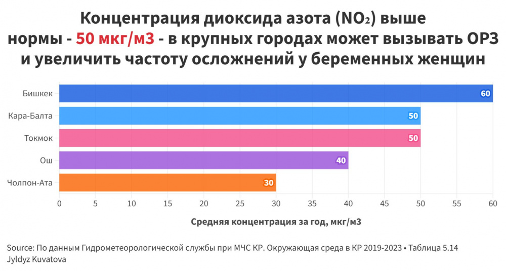 В Бишкеке, Кара-Балте и Токмоке концентрация диоксида азота превышает предельно допустимые нормы, особенно в промышленных зонах, где пересекаются выбросы заводов, отопительных котельных и плотный поток транспорта. В этих районах чаще фиксируются проблемы с дыханием, обострения хронических заболеваний и рост случаев бронхиальной астмы, что дополнительно ударяет по женщинам и детям, как наиболее чувствительным группам.
