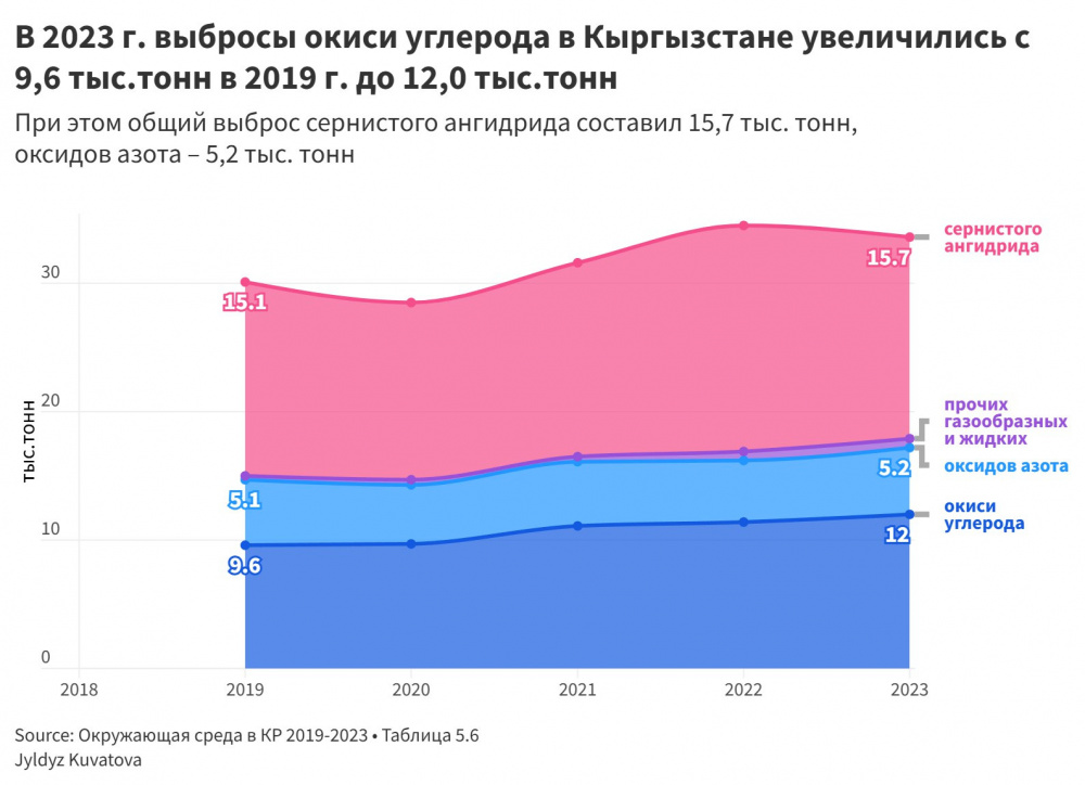 В структуре выбросов в атмосферу Кыргызстана значительную долю занимают сернистый ангидрид, а также оксиды азота и окислы углерода, действующие не только на легкие, но и на репродуктивную систему. Оксиды азота снижают фертильность и ухудшают работу дыхательной системы, особенно у детей и беременных женщин, а окись углерода уменьшает насыщение крови кислородом и повышает риск гипоксии плода.