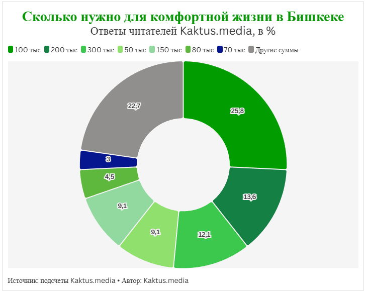 Наши читатели в социальных сетях активно предлагали свои варианты того, сколько денег им нужно для сытой жизни в столице. Предложения были разные, в том числе звучали цифры в несколько десятков тысяч долларов США и в 1 млн сомов. Но чаще всего озвучивали сумму в 100 тыс. сомов. Причем многие говорили о том, что эта сумма им нужна для того, чтобы закрывать все базовые потребности, шиковать точно не получится.