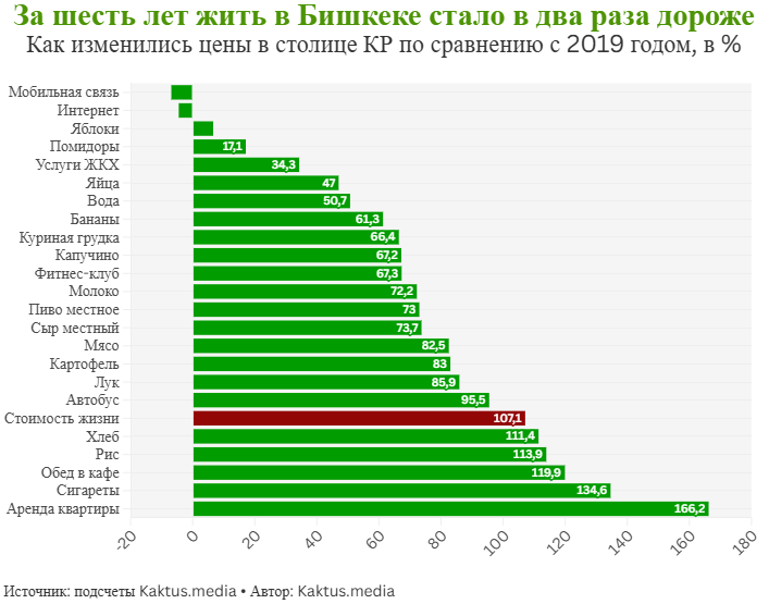 Но интересный факт: стоимость интернета и мобильной связи в столице Кыргызстана стала немного дешевле. В остальном радоваться нечему: цены выросли в среднем в полтора раза. Больше всего ожидаемо повысилась стоимость аренды жилья — почти в три раза. На второй строчке цены на сигареты, на третьей — обеды в кафе.