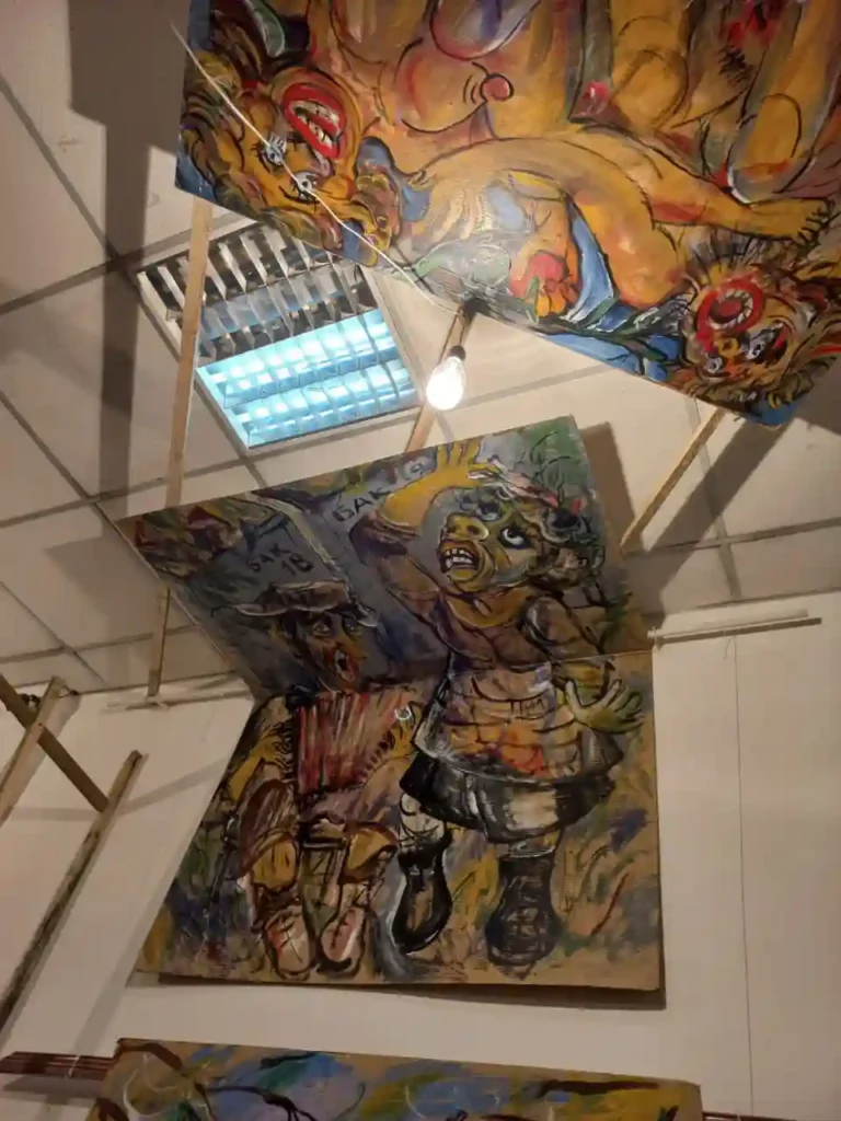 Автором этой потолочной идеи стала Лилия Позднякова, выступившая куратором выставки: «Я очень рада, что экспозиционная часть Георгия вызвала столько споров. Среди художественной общественности были как противники, так и сторонники его необычного экспрессивного стиля. Параллели с Сикстинской капеллой Микеланджело здесь неслучайны. В гротесковых полотнах Георгия есть все: от сотворения мира, через житие, до страшного суда. И если мы с Катей как члены Международного независимого женского фонда художников «Тан-Шолпан» олицетворяем более лиричный женский взгляд, то полотна Георгия – это ярко выраженный мужской стиль, внешне грубоватый, но наполненный актуальными смыслами. Меня радует, что у выставки нет равнодушных. Яркие эмоции – лучшая награда для художников».